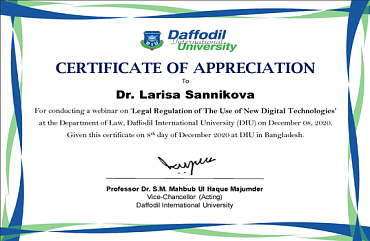 8 декабря 2020 года руководитель Центра , д.ю.н., профессор РАН Л.В. Санникова выступила в Daffodil International University (Bangladesh).