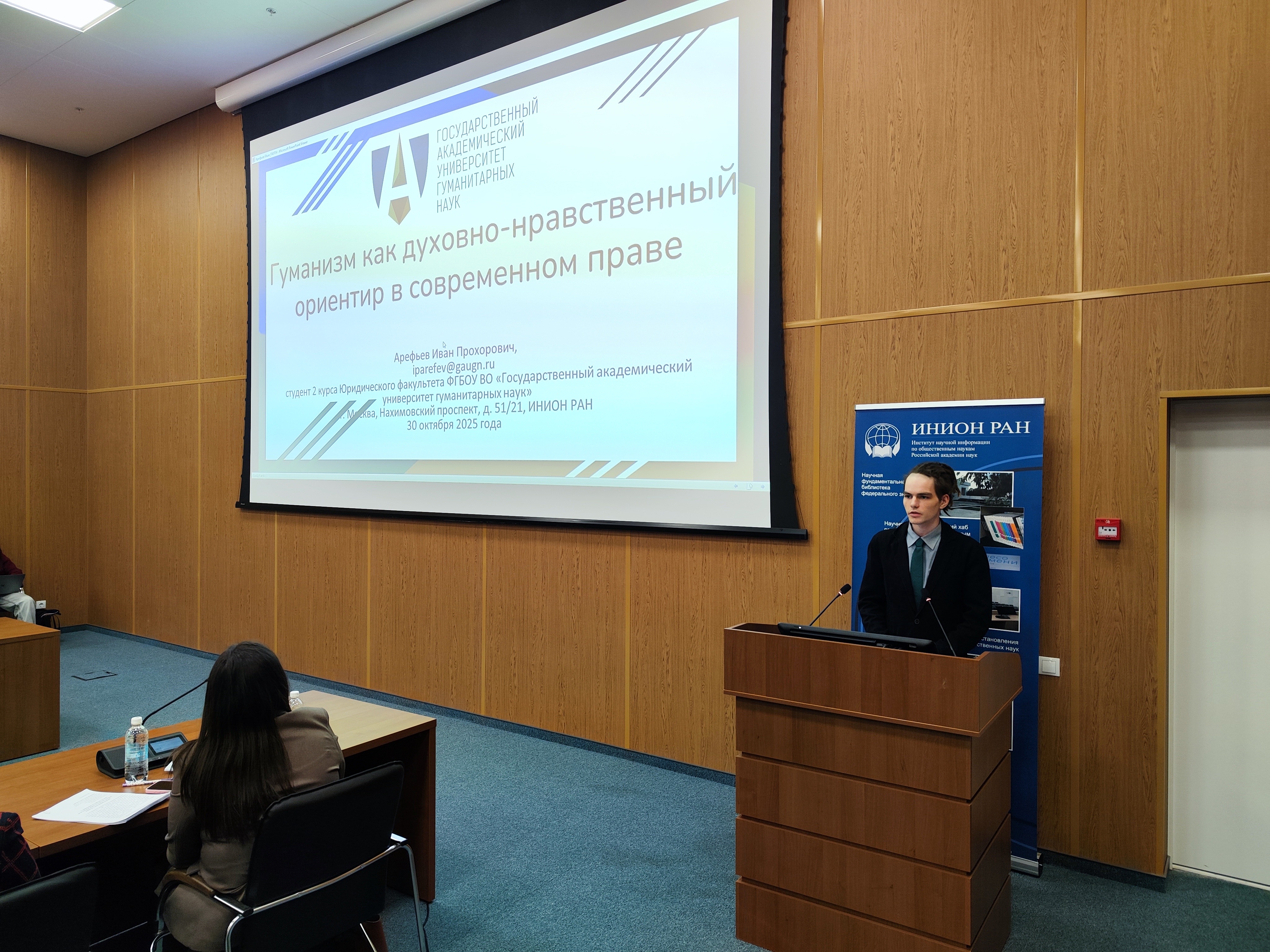 1. Иван Арефьев на тему «Гуманизм как духовно нравственный ориентир в современном праве», где подчеркнул особое значение гуманизма как одной из традиционных духовно-нравственных ценностей для правотворчества, правореализации и правоприменения.