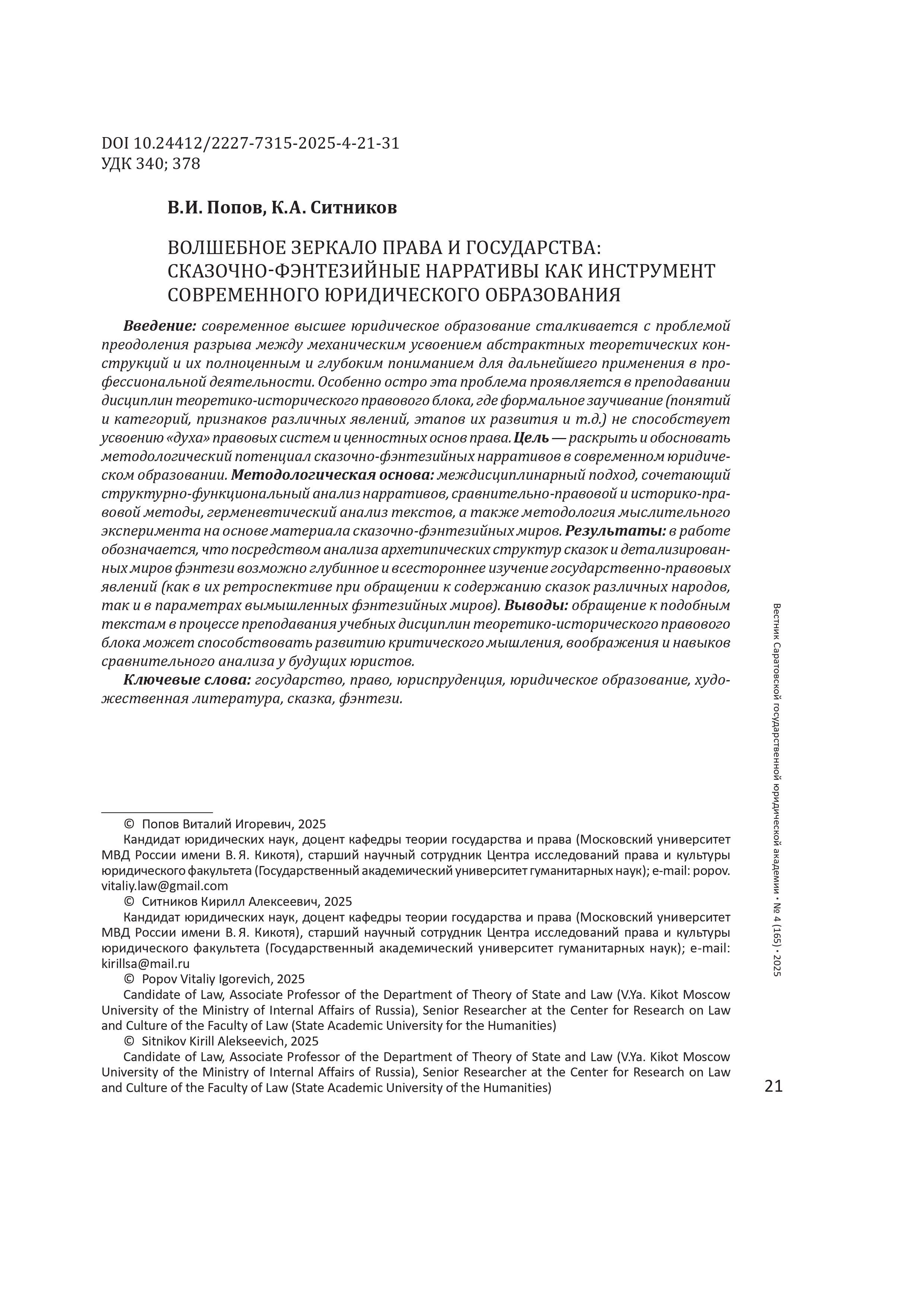 В новой научной статье старших научных сотрудников Центра исследований права и культуры Юридического факультета ГАУГН Кирилла Ситникова и Виталия Попова на тему «Волшебное зеркало права и государства: сказочно-фэнтезийные нарративы как инструмент современного юридического образования», опубликованной в журнале «Вестник Саратовской государственной юридической академии», продолжается исследование методологического потенциала сказок и фэнтези в современном юридическом образовании и преподавании юридических дисциплин, начатое ими в предшествующей публикации.