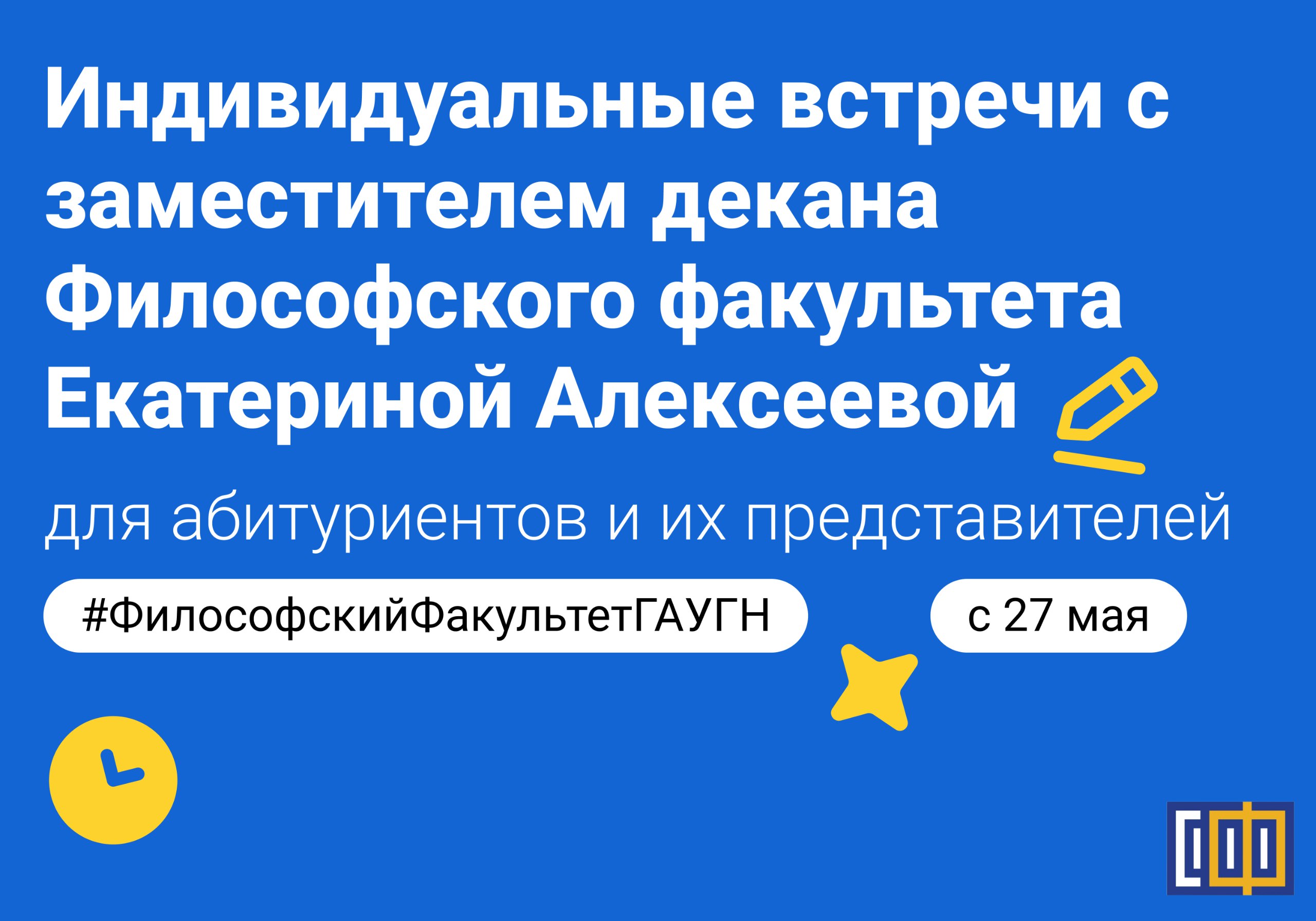 Философский факультет ГАУГН приглашает всех желающих на встречи с заместителем декана Екатериной Алексеевой.Посетители смогут задать любой интересующий вопрос касательно поступления и дальнейшего обучения на факультете.