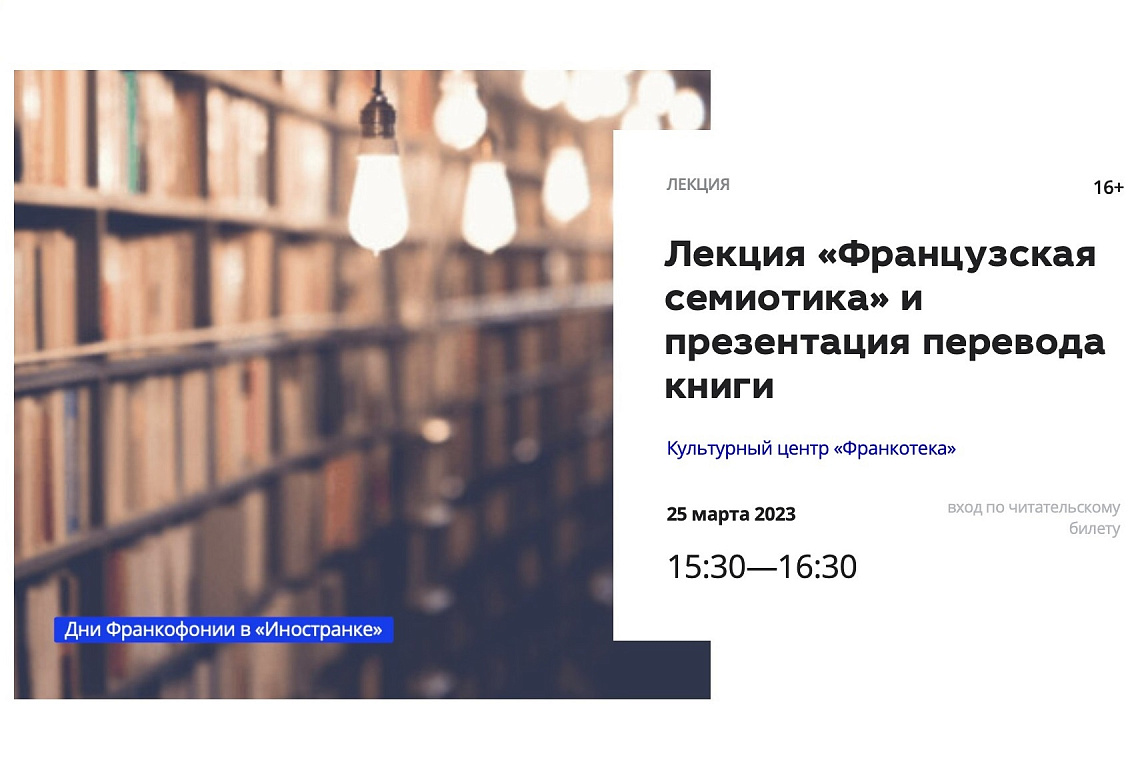 Лекция откроет новый совместный проект Франкотеки ВГБИЛ и МЦС ГАУГН, в рамках которого гости библиотеки познакомятся с семиотикой – наукой о знаках, коммуникативных системах и возникновении значения, а также с основными направлениями этой науки в XX-м и XXI-м вв.