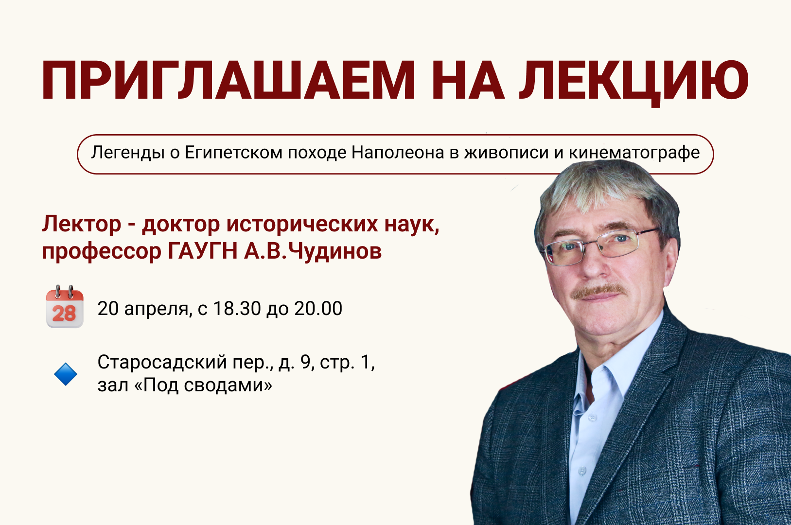 20 апреля в Исторической библиотеке состоится лекция доктора исторических наук, профессора ГАУГН Александра Викторовича Чудинова «Легенды о Египетском походе Наполеона в живописи и кинематографе»Египетский поход 1798-1801 гг. – одна из наиболее экзотических и противоречивых страниц в биографии Наполеона. Неудивительно, что многие живописцы – современники события и работавшие позднее – вдохновлялись победными и трагичными страницами этого похода. В ХХ и XXI вв. к теме Египетской экспедиции обратились авторы художественных и документальных фильмов. Насколько визуальные образы, созданные художниками и режиссерами, соответствуют реально происходившему?