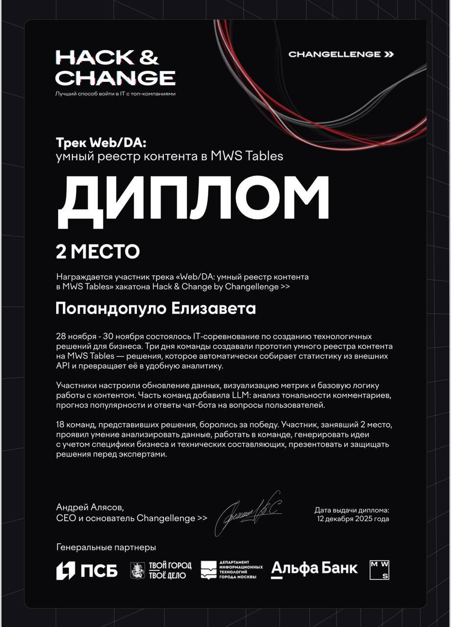 Елизавета Попандопуло заняла второе место, продемонстрировав высокий уровень профессионализма и креативного подхода к решению поставленной задачи.
