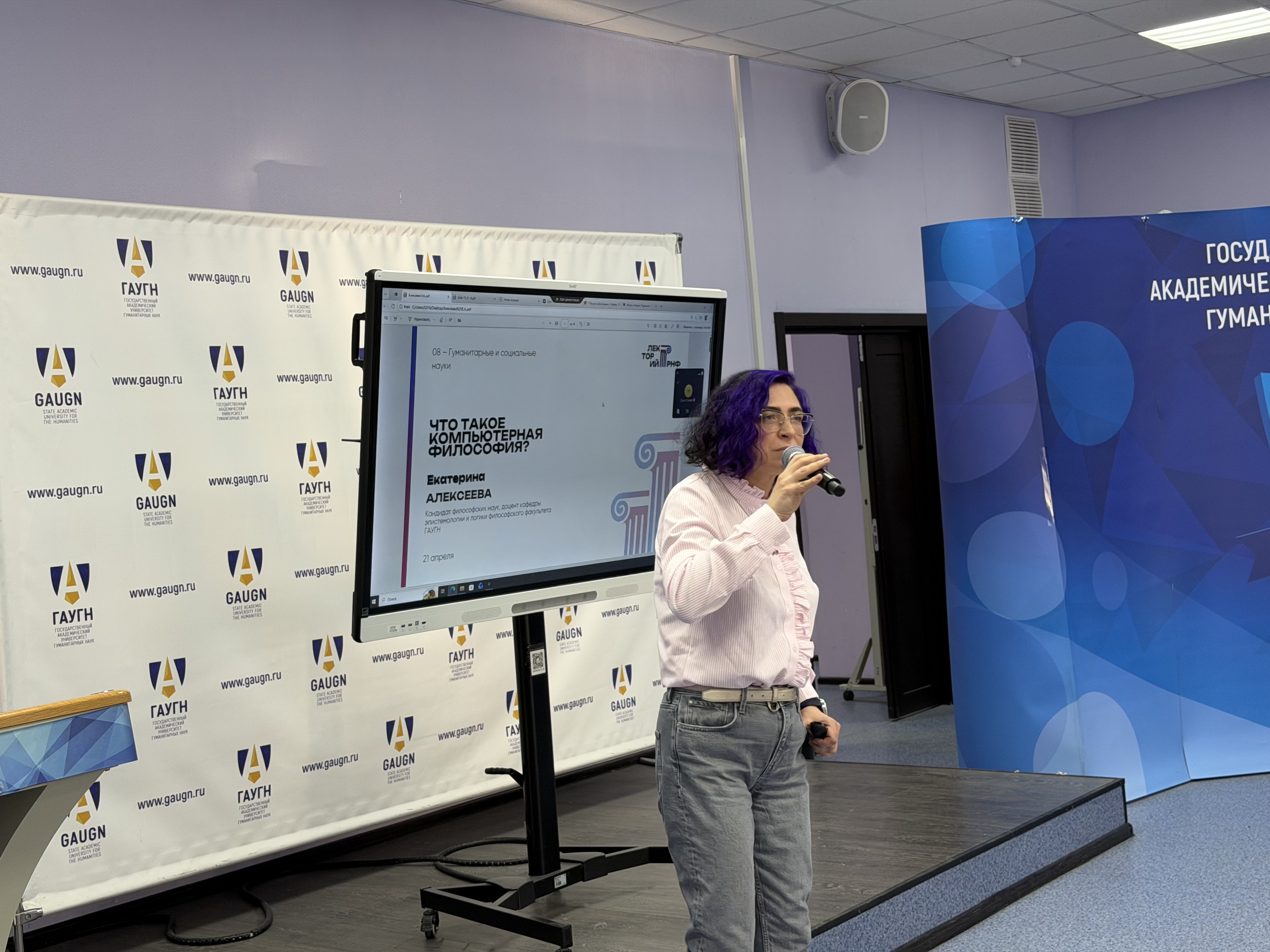 Лекцию «Что такое компьютерная философия?» представила заместитель декана Философского факультета ГАУГН Екатерина Алексеева, осветив современные подходы к применению цифровых технологий в философских исследованиях.