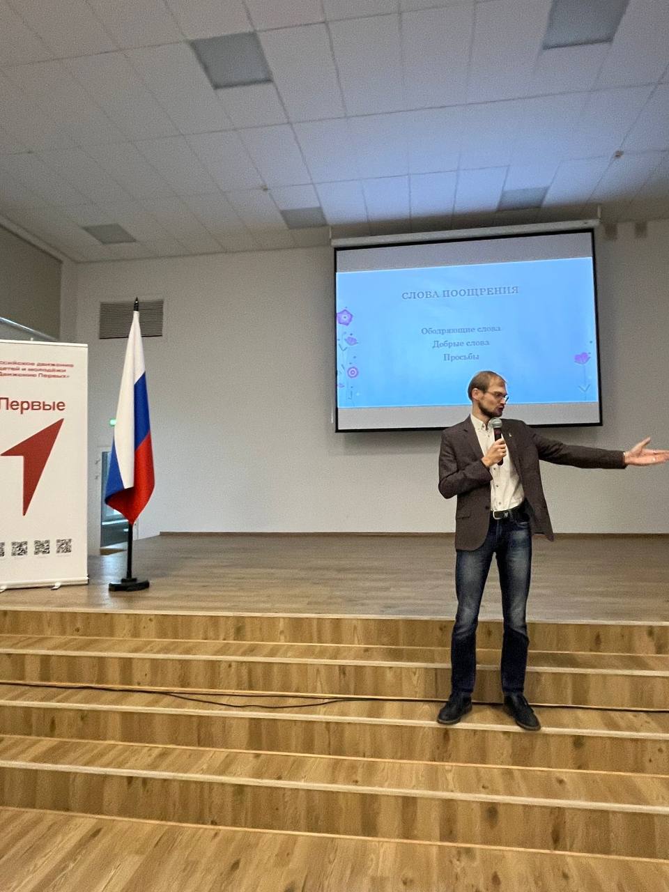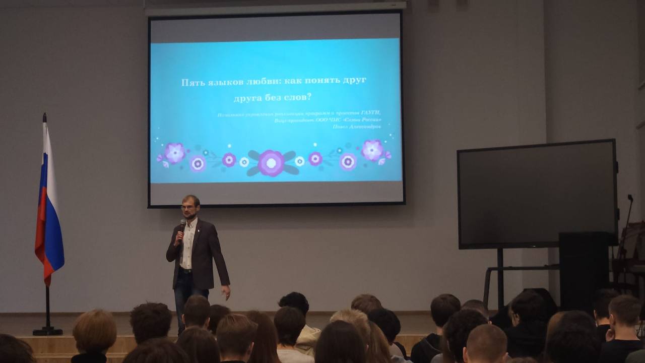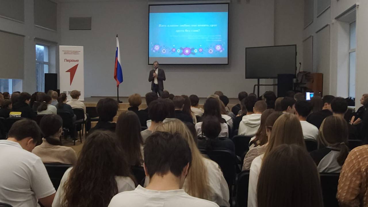 Начальник управления реализации программ и проектов, наставник первичного отделения Движения первых ГАУГН, вице-президент общероссийской общественной организации «Семьи России» Павел Александров провел лекцию «Пять языков любви: как понять друг друга без слов?», на котором рассказал о социальном вкладе института семьи в современной России и значении любви в семье в развитии молодежи.