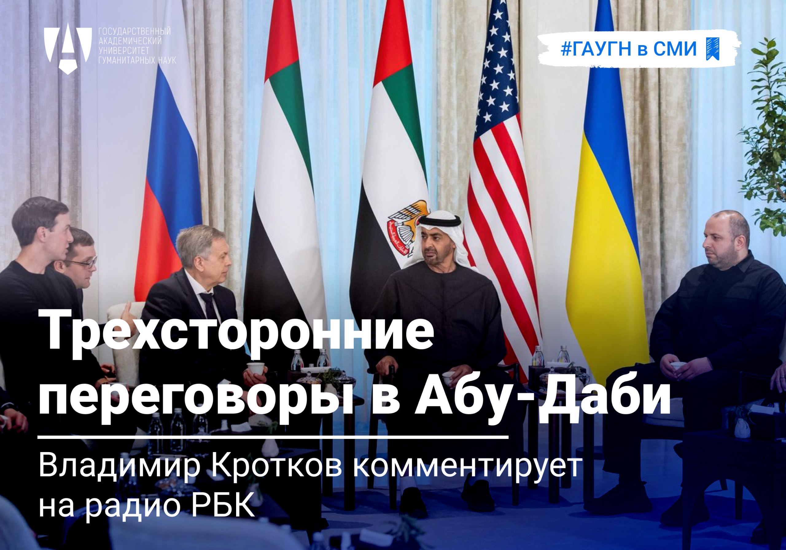 Профессор Факультета политологии ГАУГН Владимир Кротков выступил в эфире радио РБК, где прокомментировал ход и повестку российско-украинских переговоров при посредничестве США в Абу-Даби. По словам эксперта, ключевым вопросом остаются территории, а вероятных сценариев много — от отвода войск до создания свободной экономической зоны. При этом никуда не уходит вопрос восстановления территорий и спонсирования этого процесса.