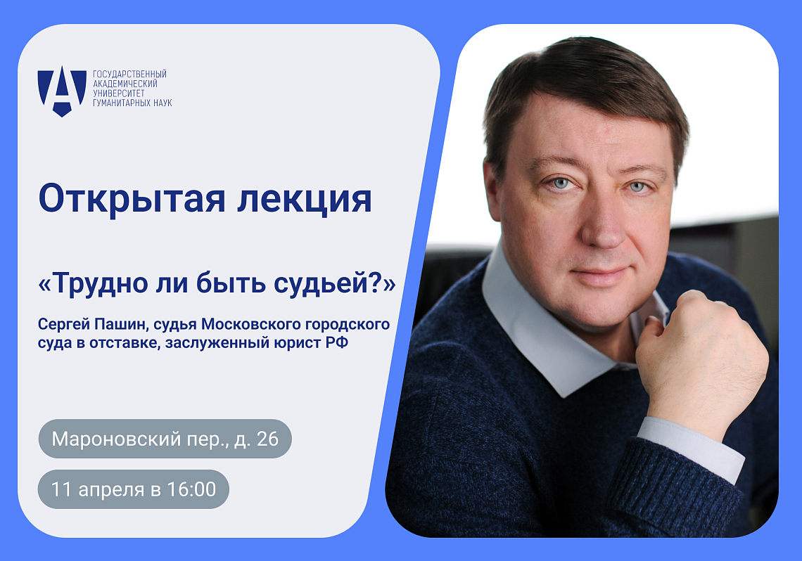 В роли лектора выступит судья Московского городского суда в отставке, заслуженный юрист РФ Сергей Пашин. На государственной службе в Администрации Президента РФ эксперт занимался судебной реформой, обеспечил введение в России суда присяжных. Работал федеральным судьей в Москве, рассматривал уголовные дела. Кроме того, Сергей Пашин вел телевизионную программу «Федеральный судья» на Первом канале, а также является автором шести сборников стихов. На данный момент преподает право студентам в МВШСиЭН и ГАУГН.