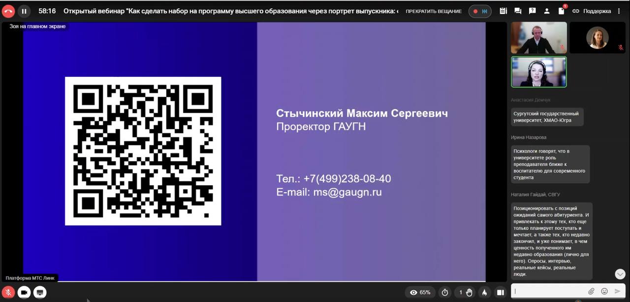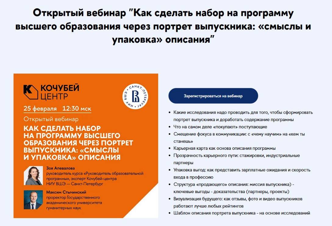 Проректор ГАУГН Максим Стычинский выступил в качестве приглашенного спикера на открытом вебинаре Кочубей-Центра «Как сделать набор на программу высшего образования через портрет выпускника: «смыслы и упаковка» описания», состоявшемся 25 февраля.Выступление Максима Стычинского было посвящено практическому опыту ГАУГН по трансформации подхода к набору студентов. На примере направления «Лингвистика» он подробно разобрал кейс университета, который позволил увеличить набор на программу в пять раз. Ключевым фактором успеха стал отказ от описания образовательного процесса в пользу создания для абитуриента прозрачного и осязаемого «портрета выпускника» с конкретными карьерными ролями.