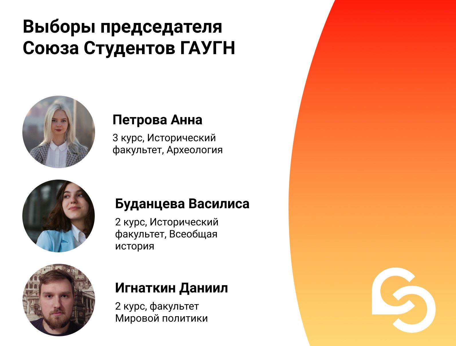 Уже 8 ноября Союз Студентов по итогам отбора опубликовал полный список зарегистрированных кандидатов. Кандидатами на пост Председателя Союза Студентов зарегистрированы: