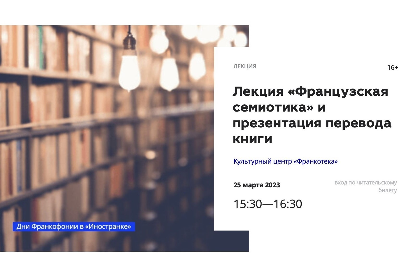 Лекция откроет новый совместный проект Франкотеки ВГБИЛ и МЦС ГАУГН, в рамках которого гости библиотеки познакомятся с семиотикой – наукой о знаках, коммуникативных системах и возникновении значения, а также с основными направлениями этой науки в XX-м и XXI-м вв.