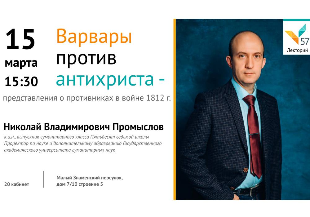 15 марта в рамках Молодежного научно-образовательного форума «История России сквозь времена и эпохи» на базе Московской школы №57 пройдет лекция её выпускника 1997 года, проректора по науке и дополнительному образованию ГАУГН, кандидата исторических наук Николая Промыслова на тему «Варвары против антихриста – представления о противниках в войне 1812 года».Отечественная война 1812 года или в европейской традиции – поход Наполеона в Россию – стал важнейшим историческим событием для всех участников конфликта. Для императора французов эта кампания стала переломной в его карьере, менее чем через полтора года после выхода его войск из России он вынужден был отречься от престола и покинуть Францию. Для нашей страны эта война также стала знаковой, после которой начались совершенно новые для России процессы строительства нации, а участники войны еще много лет впоследствии определяли внутреннюю политику страны.