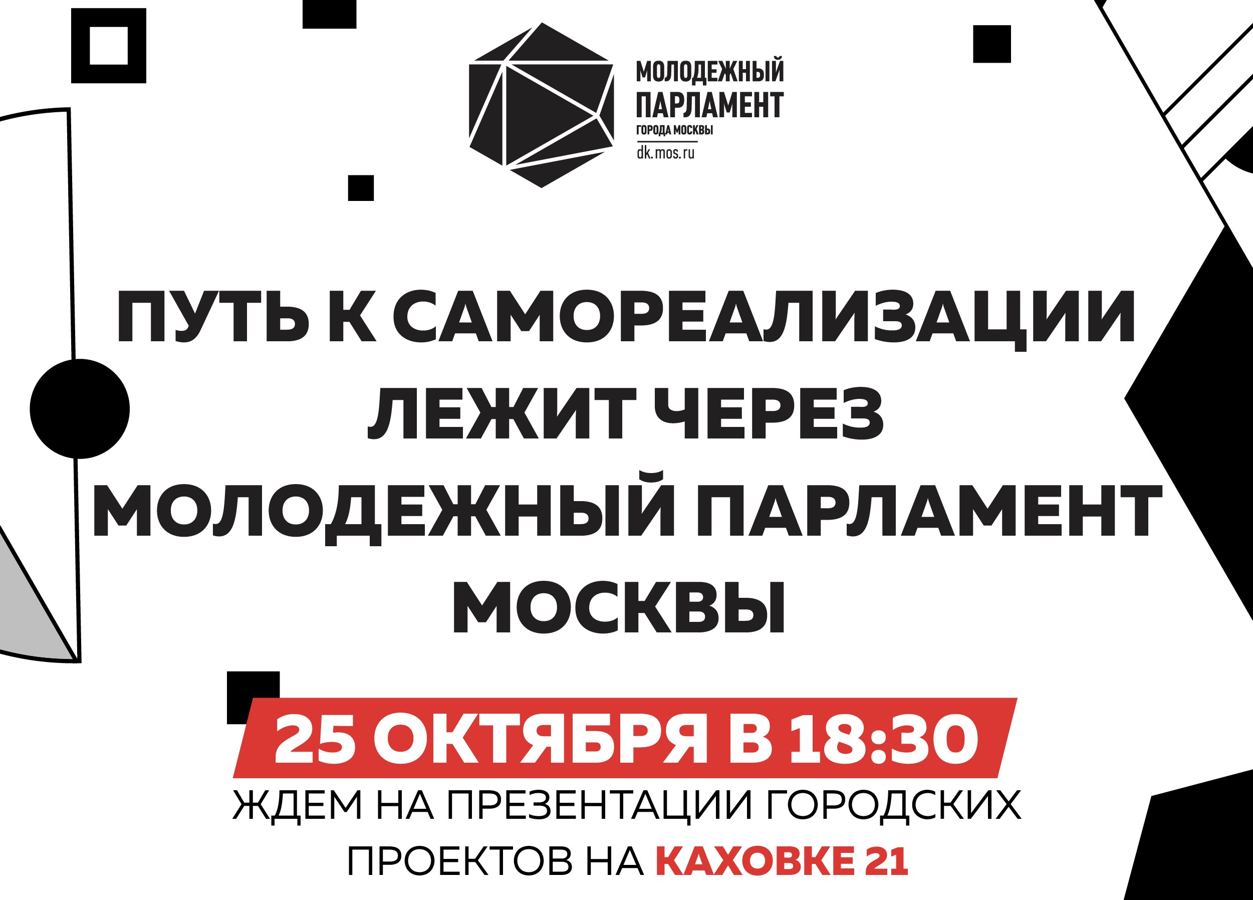 25 октября 2022 года в 18:30 пройдет презентация городских проектов Молодёжного парламента города Москвы, которые проводятся с целью развития надпрофессиональных компетенций участников. Мероприятие состоится в Центре молодёжного парламентаризма (улица Каховка, дом 21).