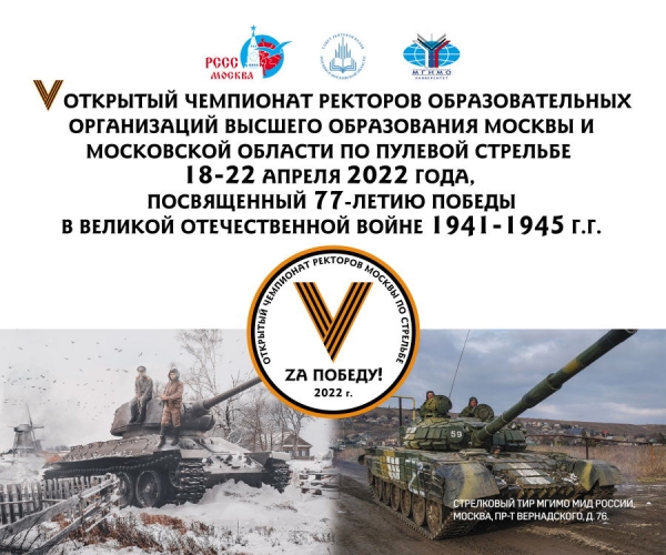 С 18 по 22 апреля 2022 года Московское региональное отделение Российского студенческого спортивного союза и Совет ректоров высших учебных заведений Москвы и Московской области провело V открытый Чемпионат ректоров по пулевой стрельбе, посвященный 77-летию Победы в Великой Отечественной войне 1941-1945 годов.