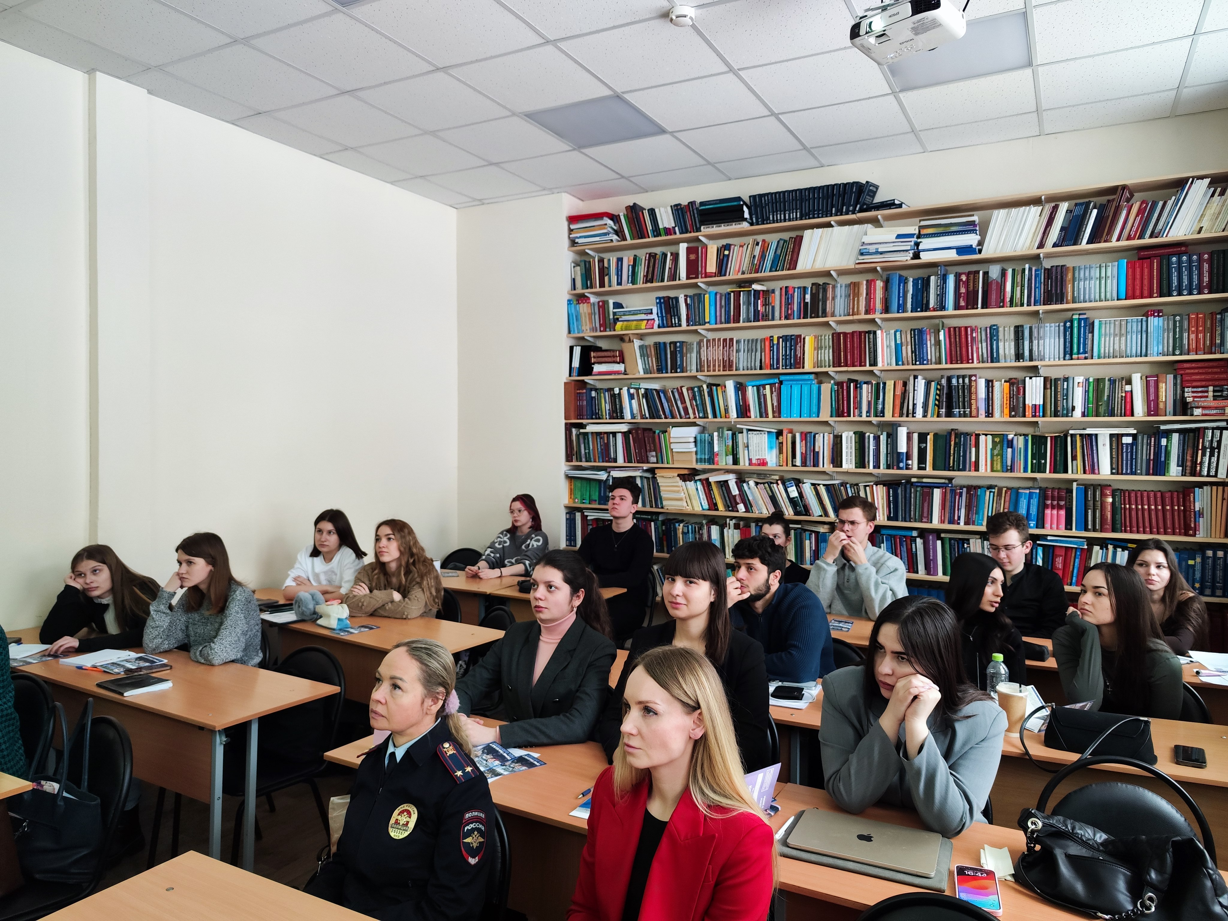 Со студентами встретились врио начальника отдела по работе с личным составом УВД по СВАО ГУ МВД России по г. Москве Алина Драбинка, старший специалист отделения по учёту кадров отдела по работе с личным составом УВД по СВАО ГУ МВД России по г. Москве Елена Леванова, старший эксперт Экспертно-криминалистического центра УВД по СВАО ГУ МВД России по г. Москве Лариса Михайлова.