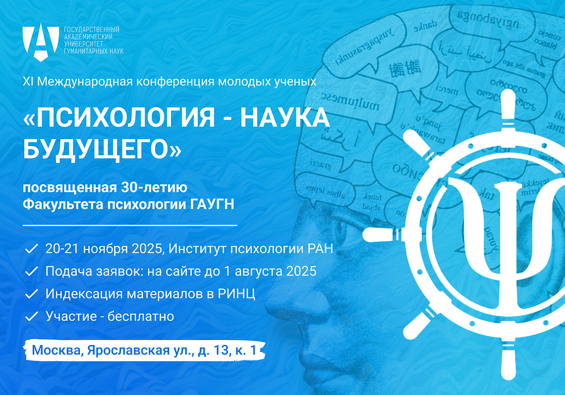Факультет психологии ГАУГН и Институт психологии РАН приглашают студентов, магистрантов, аспирантов и молодых ученых принять участие в XI Международной конференции молодых ученых «Психология – наука будущего».